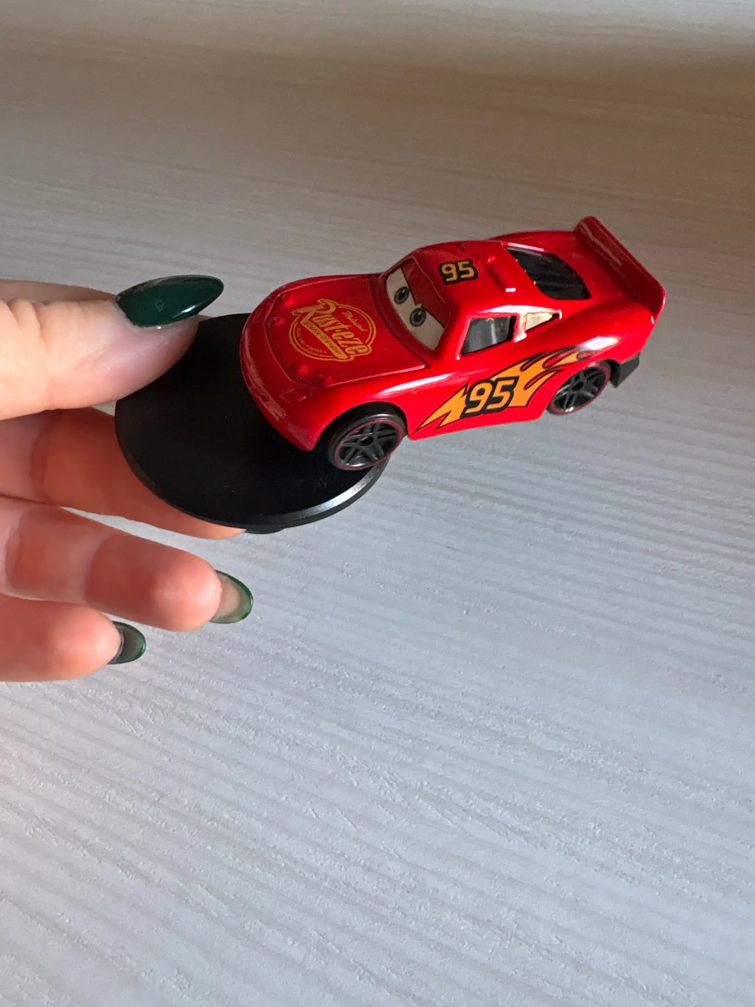 Clean your dashboard or center console surface thoroughly and let it dry completely. Peel the protective film from the adhesive base of the Lightning McQueen figure. Position the decoration in your desired location and press firmly for 10-15 seconds to ensure secure attachment. Allow 24 hours for the adhesive to fully bond before exposing to extreme temperatures. Enjoy watching Lightning McQueen drift and rotate as you drive, bringing joy and nostalgia to every journey.